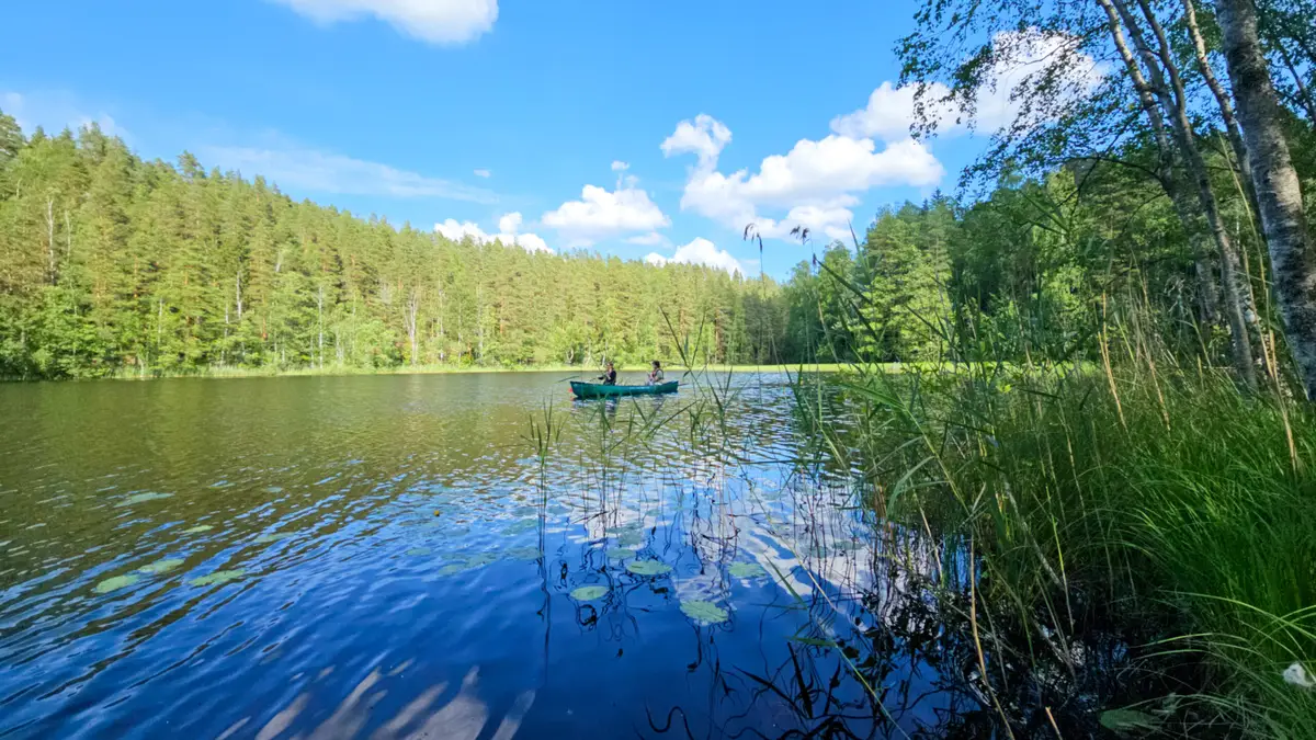 Scenic summer view of Haukkalampi pond in Nuuksio National Park, Espoo, Finland, featuring serene water and lush green forest with a person canoeing.